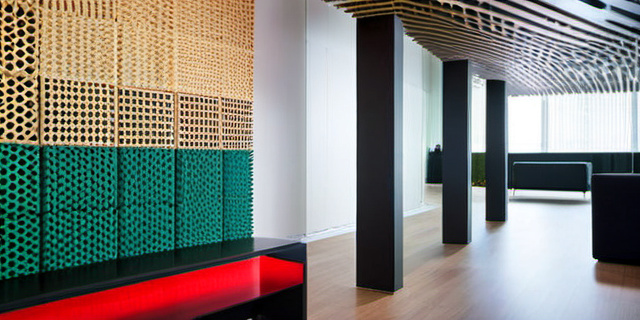 Подвесные потолки с акустическими вставками эффективно контролируют звук. Кроме того, они дают возможность создать необычные геометрические формы и световые эффекты.